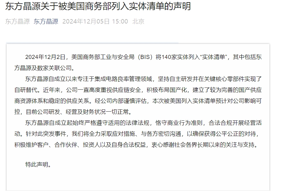 东方晶源回应被美国商务部列入实体清单:预计对公司影响可控股票策略网站东方晶源回应被美国商务部列入实体清单:预计对公司影响可控