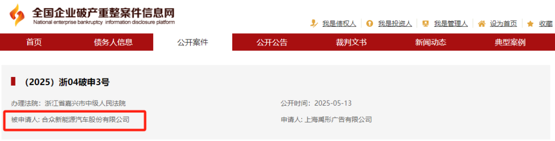 5月14日,记者查询全国企业破产重整案件信息网发现,哪吒汽车的关联公司合众新能源汽车股份有限公司(以下简称合众新能源)新增一则破产审查案件,公开时间为2025年5月13日。